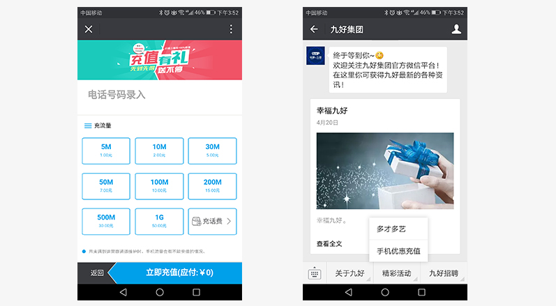 在企业微信公众号上提供流量充值入口,提供比三大运营商更优惠的价格,提高员工、平台客户的归属感。